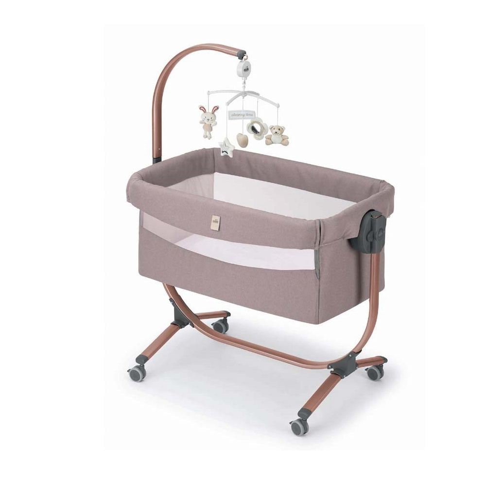 8 heights, drop-side opening for co-sleeping function, anti-reflux position, horizontal movement of the cradle (moves up to 16 cm.) for compatibility with all types of bed, rocking function, 4 swivel wheels of which 2 have a brake, straps for fastening to the bed. Includes: metal frame, removable rod for net and mobile, soft mattress with mattress cover (L 85, W 50, H 3 cm), soft fabric interior, net window.